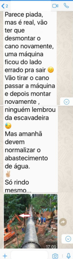 Usando imagens feitas no local, afirmam que a adutora recolocada terá de ser desmontada para permitir a retirada das máquinas do local, gerando desinformação e pânico em pessoas que desde domingo são afetadas com a intermitência ou com o desabastecimento. A "informação" é obviamente mentirosa. O local onde estão sendo feitos os consertos tem duas trilhas de saída, uma por baixo e outra por cima da mata.