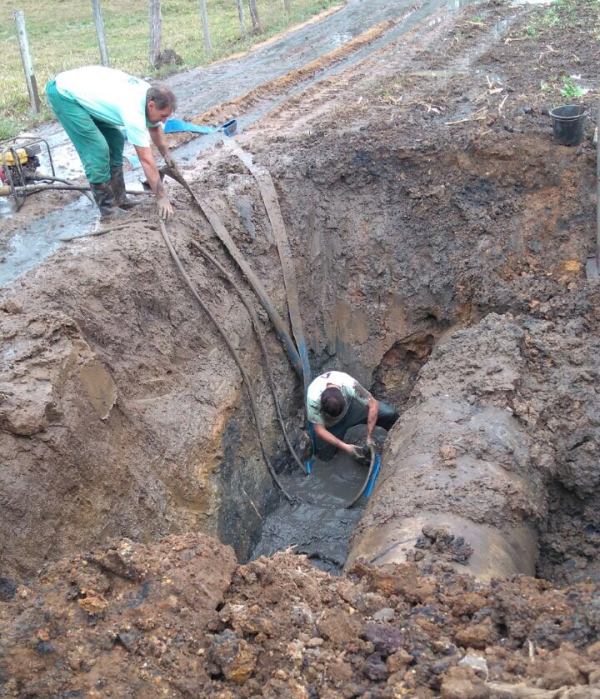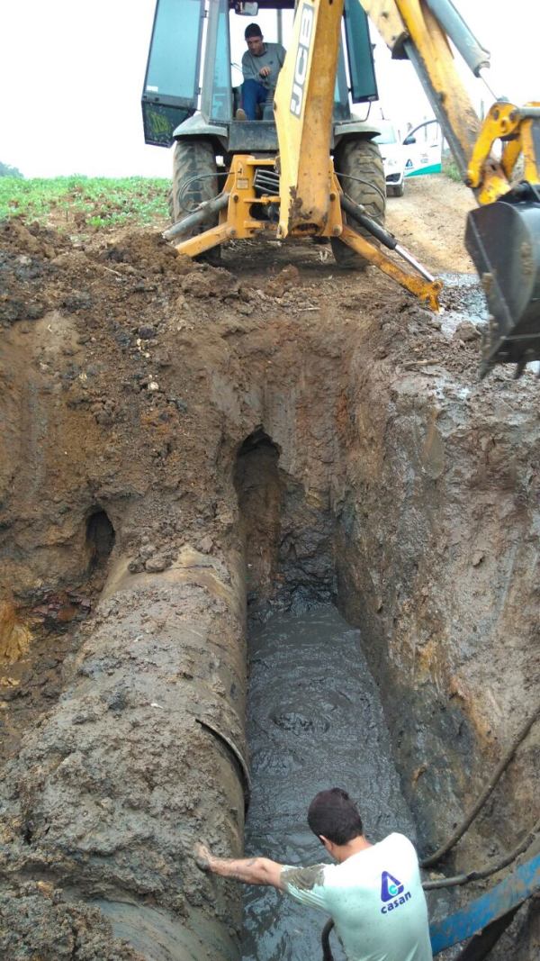Com auxílio de uma retroescavadeira, a equipe estancou o vazamento na adutora de 1.000mm que conduz água bruta desde a Barragem do Rio São Bento até a comunidade de Picadão, município de Nova Veneza, numa extensão total de 12 quilômetros.
