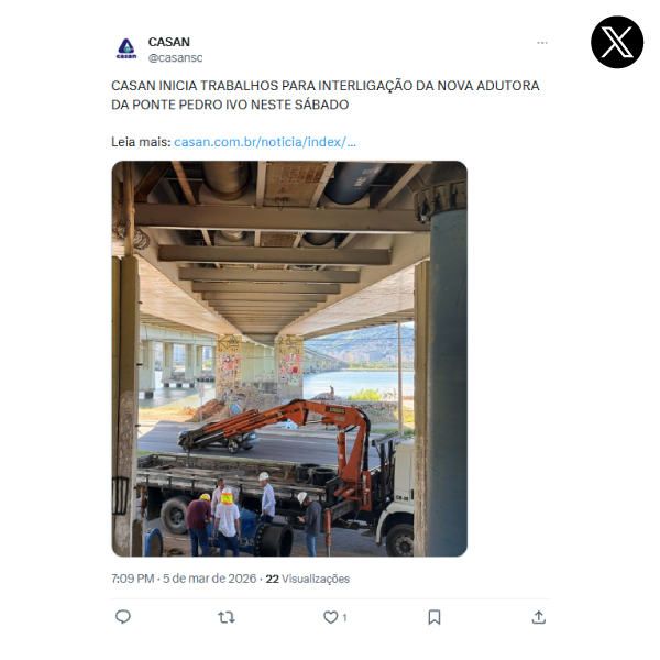 Acervo CASAN A CASAN (Companhia Catarinense de Águas e Saneamento) concluiu a obra da nova Adutora de Água Tratada da Ponte Pedro Ivo Campos, em Florianópolis. Com os trabalhos finalizado...