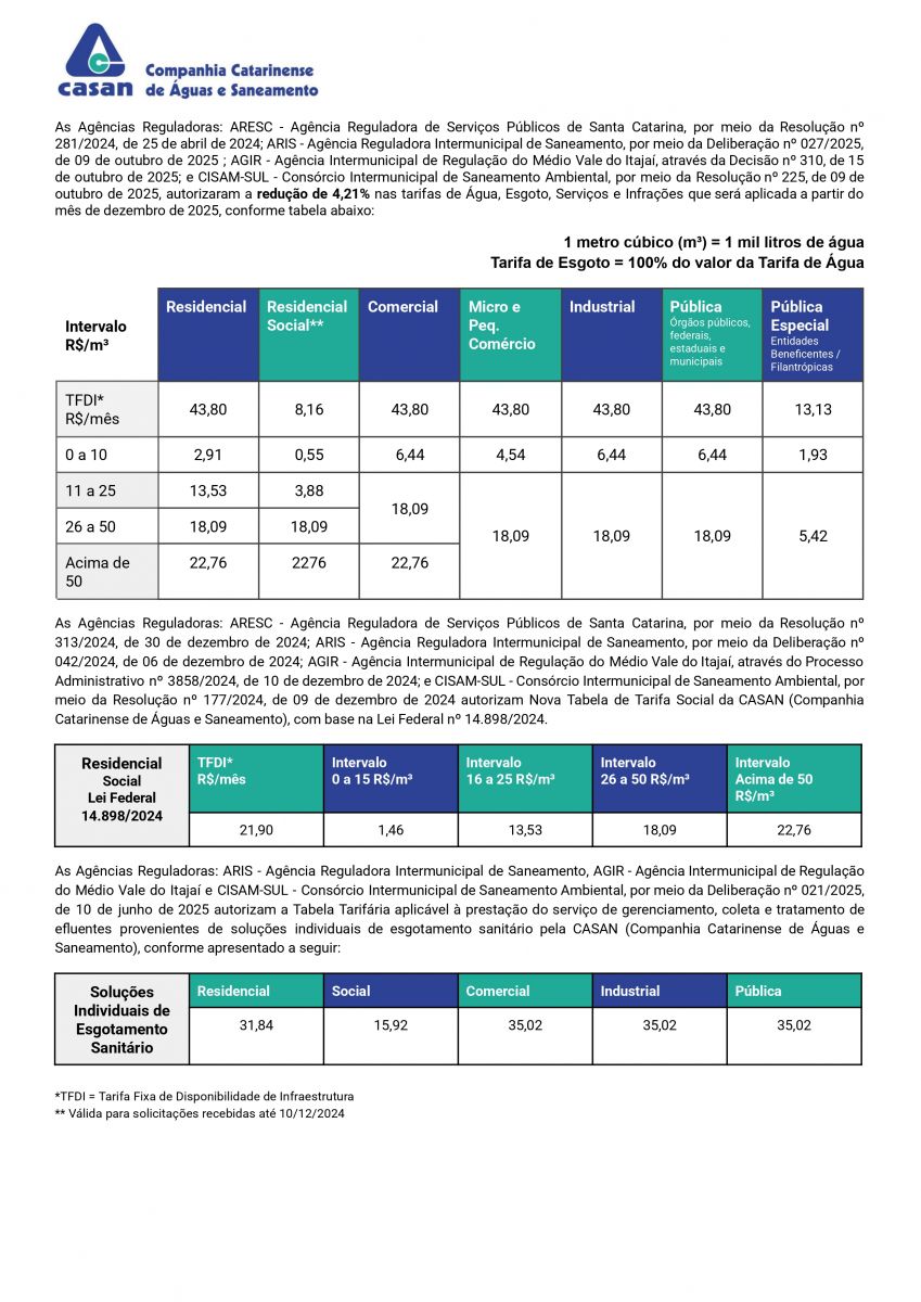 A tabela tarifária da CASAN, é válida para todo o Estado, independente do tipo e complexidade da Estação de Tratamento de Água e do manancial de abastecimento. Está estabelecida de acordo com as categorias de nossos Usuários e suas respectivas faixas de consumo.