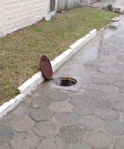 Os Poços de Visitas, que possuem tampas redondas de ferro com símbolo da CASAN, são locais onde os profissionais têm acesso à rede de coleta de esgotos para manutenções. Além de não resolver problemas de alagamentos das ruas, abrir esses equipamentos é um vandalismo, que pode ser multado.