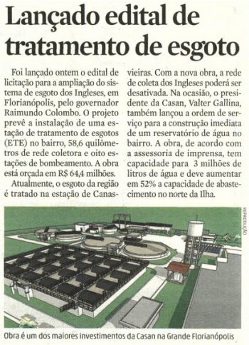 O lançamento da obra de ampliação do Sistema de Esgotamento Sanitário dos Ingleses e o anúncio de mais um reservatório de água para o bairro do Norte da Ilha reuniram no gabinete do governador a cúpula do Estado. Estavam, além do governador Raimundo Colombo, o vice Eduardo Pinho Moreira, o prefeito da cidade, Cesar Souza Junior, dois dos mais influentes deputados estaduais, Gean Loureiro e João Amin, além de vereadores, lideres empresariais e comunitários.Toda a diretoria da CASAN, além de gerentes das áreas de Construção e de Projetos, prestigiaram o evento liderado pelo presidente Valter Gallina, que no mesmo dia teve seu artigo sobre a importância do sistema de esgoto publicado no Diário Catarinense. Veja a repercussão em alguns dos veículos de Comunicação: