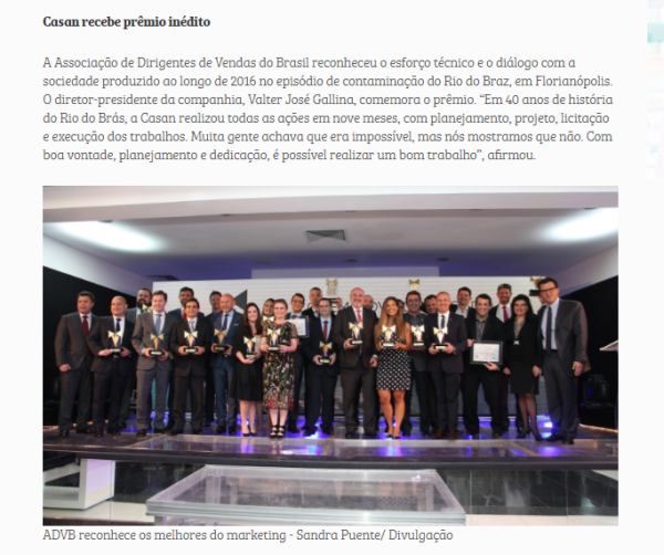 Era voz corrente no salão de festas do Clube Lira Tênis Clube, em Florianópolis, o significado especial do prêmio Top de Marketing entregue à CASAN na noite desta quarta-feira, dia 22, pela ADVB-SC.
