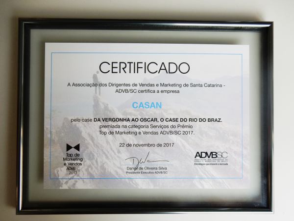 O Top de Marketing e Vendas na categoria Serviços, conquistado pela CASAN, foi entregue pelo prefeito de Florianópolis, Gean Loureiro, e pelo publicitário, Juarez Beltrão, representando a diretoria da entidade de classe organizadora do evento.