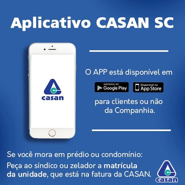 Para outros serviços, neste período de coronavírus a Companhia orienta o uso dos Canais de Relacionamento a Distância, no site www.casan.com.br e da Central de Atendimento 0800 643 0195.