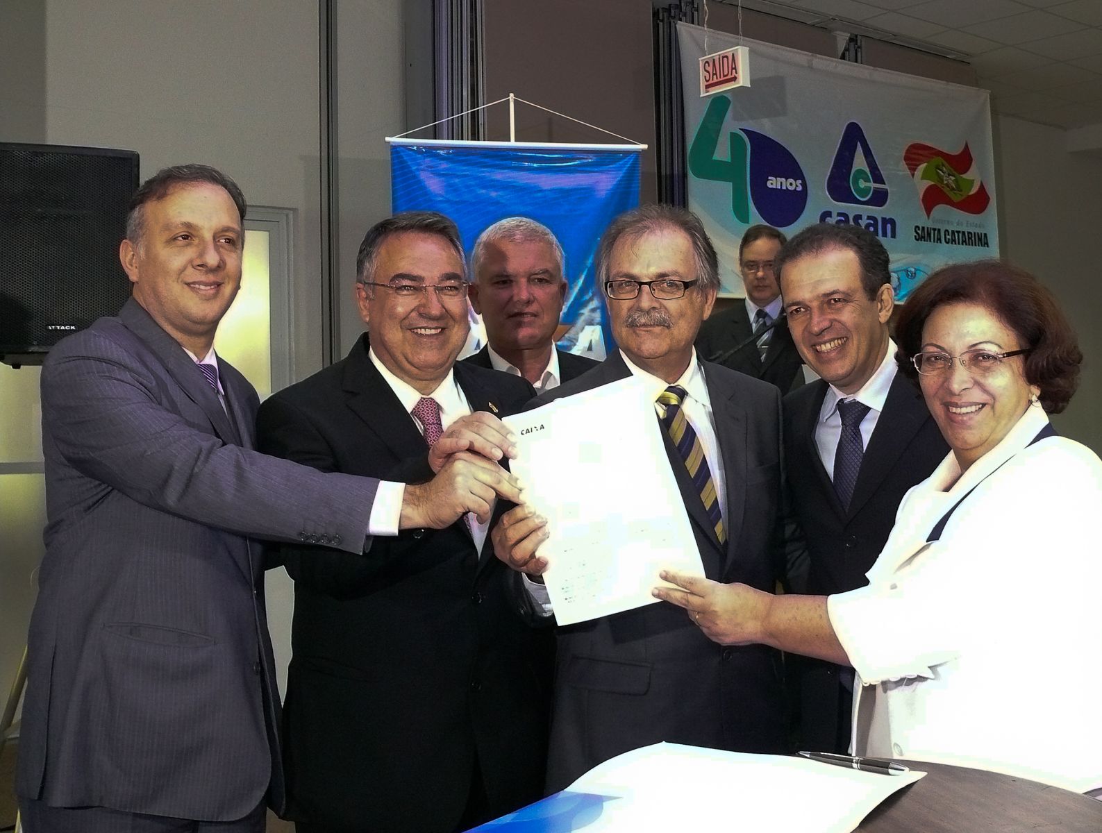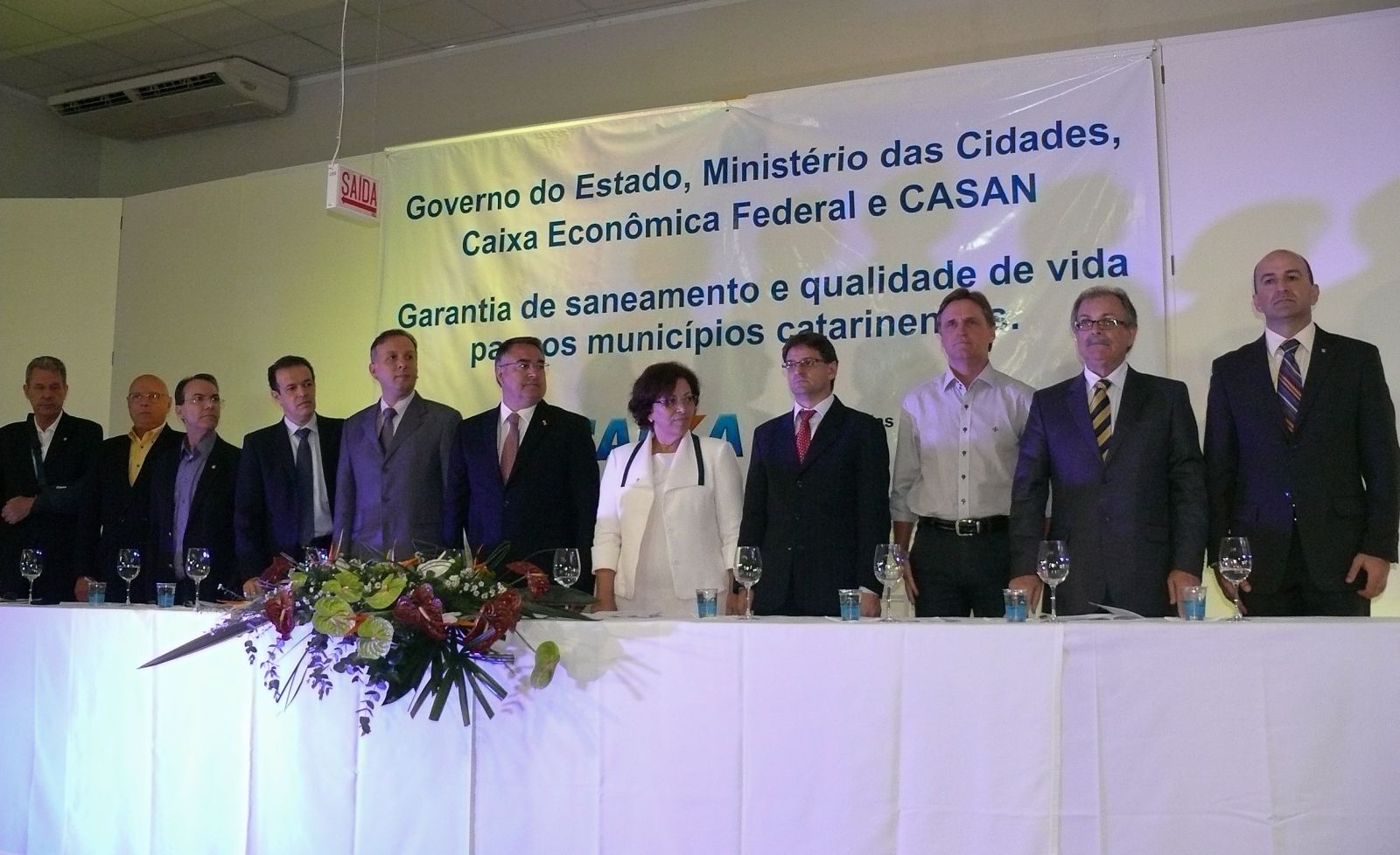 Santa Catarina deu um passo importante na ampliação do saneamento básico nesta segunda-feira (16), com a assinatura de contratos de financiamento no valor de R$ 404,7 milhões, resultado de uma parceria entre os governos Federal e Estadual por meio de projetos da CASAN . Os municípios beneficiados nesta etapa serão Florianópolis, Criciúma, São José, Biguaçú, Rio do Sul e Concórdia, atendendo uma população de 920 mil habitantes. A solenidade aconteceu na sede da Associação Catarinense de Medicina (AMC) e teve a presença do ministro das Cidades, Aguinaldo Ribeiro e Ministra das Relações Institucionais , Ideli Salvatti, além do Secretário Nacional do Saneamento Leodegar Tiscoski , governador Raimundo Colombo e diretor da Caixa Econômica Federal Valter Nunes Gonçalves.