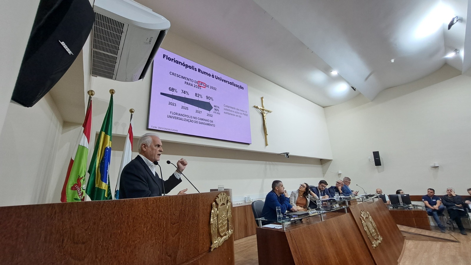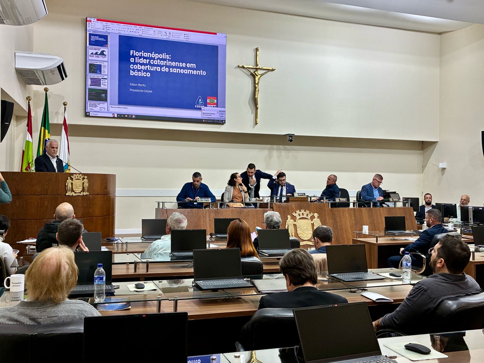 Em uma Audiência Pública realizada na Câmara Municipal de Florianópolis nesta terça-feira (15), o presidente da CASAN (Companhia Catarinense de Águas e Saneamento), Edson Moritz, apresentou um panorama da gestão, dos investimentos e avanços obtidos no saneamento da Capital. O encontro tratou do Sistema de Saneamento Básico da Capital, com o objetivo de promover o diálogo entre o poder público, instituições, especialistas e a sociedade civil sobre os desafios e soluções para cumprir o Marco do Saneamento.