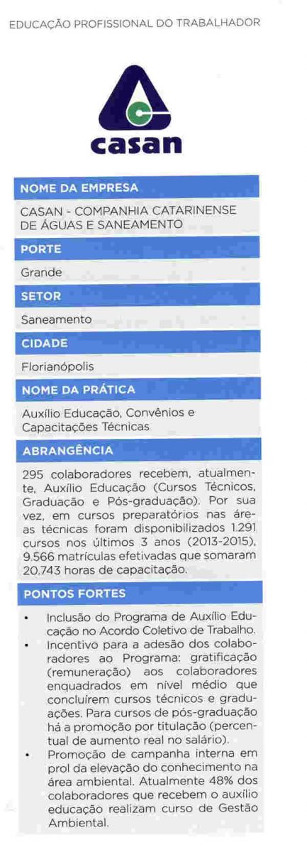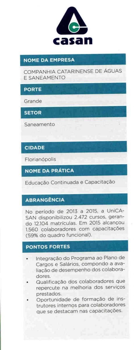 A Companhia é citada na publicação pois foi uma das 106 instituições que concorreram ao Prêmio Santa Catarina pela Educação em duas categorias: Educação Profissional do Trabalhador ( apresentando o benefício Auxílio Educação e a elevação da escolaridade dos empregados) e na categoria Educação Corporativa (apresentando ações de treinamento e capacitação).