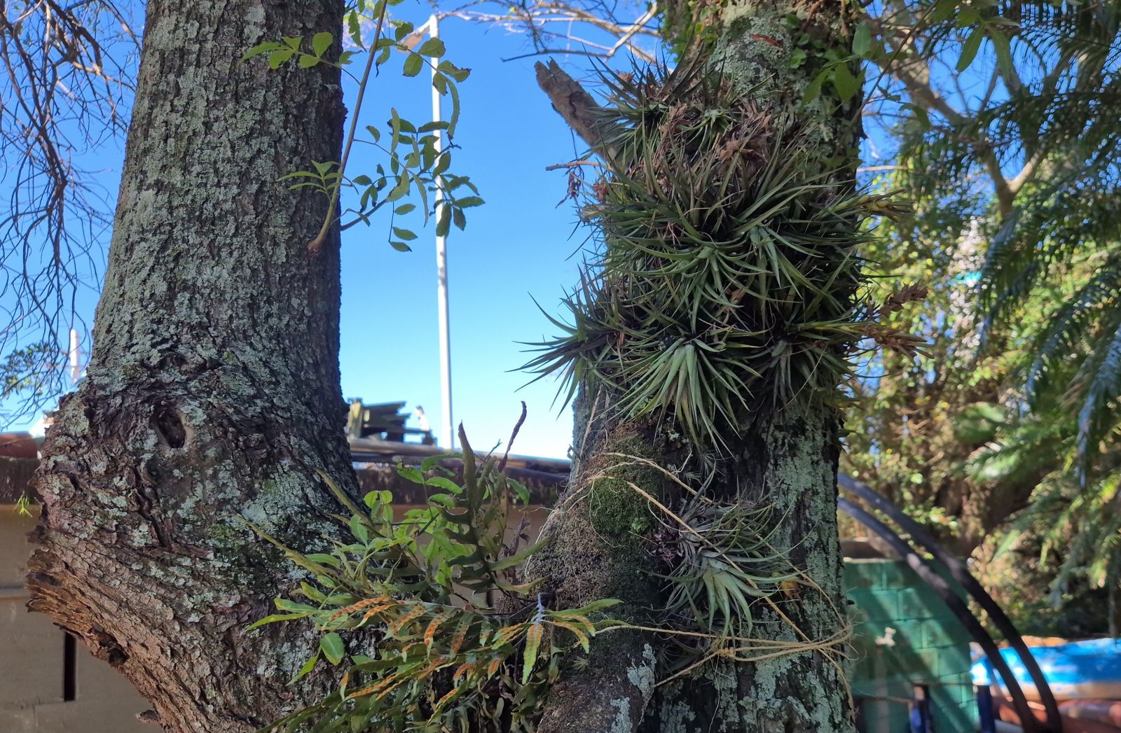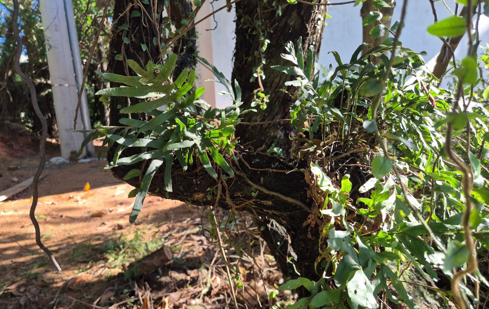 Nas árvores cortadas no terreno da ETE Insular foram resgatadas pequenas orquídeas, bromélias e samambaias, espécies epífitas que utilizam troncos e galhos como suporte para se fixar. O cuidado leva em conta a importância paisagística e ecológica dessas plantas que criam microambientes, fornecendo água, abrigo e alimento para insetos e outros animais.