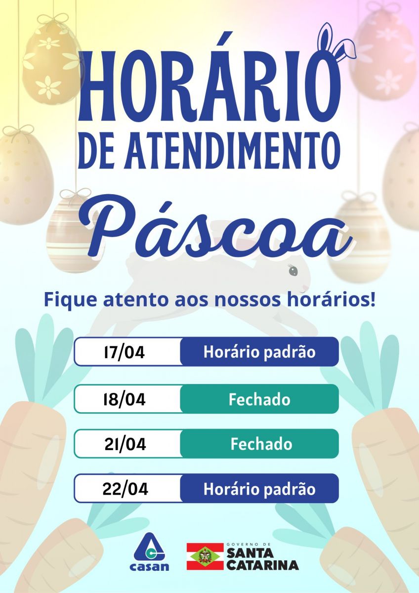 A CASAN (Companhia Catarinense de Águas e Saneamento) informa que não haverá atendimento presencial nas agências durante os feriados nacionais da Sexta-feira Santa (18) e Tiradentes (21).
