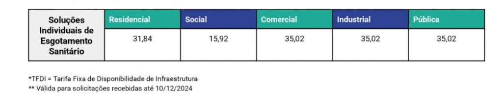 A informação nas faturas será realizada de acordo com a situação do imóvel em relação à nova modalidade de serviço. No caso de imóveis já vistoriados, e considerados aptos para execução da limpeza periódica, a mensagem será sobre a necessidade de agendamento da coleta de lodo. Após o execução desse serviço, será então enviada mensagem sobre o início do pagamento pelo serviço, que terá custo mensal de R$ 31,84 (Tarifa Residencial), e de R$ 35,02 (Tarifa Comercial). Veja os demais valores por categoria abaixo.