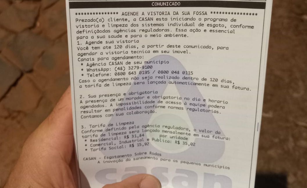 “A adesão ao Programa Esgotamento Sobre Rodas é realizada entre CASAN e Prefeitura, com acompanhamento da Agência Reguladora, e o morador poderá receber aviso sobre início de cobrança mesmo sem ter agendado as vistoria iniciais. Por esse motivo, é importante que as pessoas estejam atentas e agendem estas visitas, esclareçam suas dúvidas e preparem seu imóvel para receber o serviço”, explica o engenheiro da CASAN Alexandre Trevisan.
