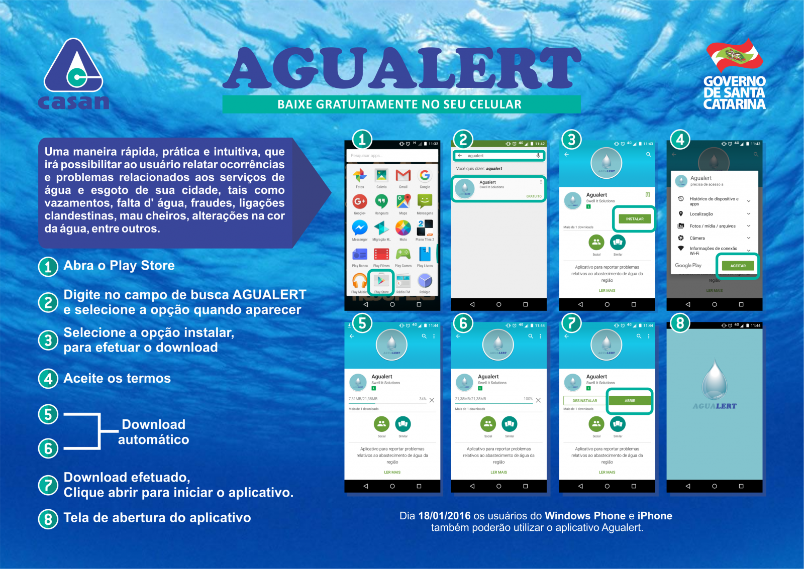 Para usar o Agualert basta acessar a playstore e baixar o aplicativo gratuitamente. O alerta do usuário possibilitará que a Companhia abra mais rapidamente uma ordem de serviço para a resolução do problema. O Agualert estará disponível para o Sistema Android neste primeiro mês e, a partir de 18 de janeiro, para os usuários do Windows Phone e do iPhone.