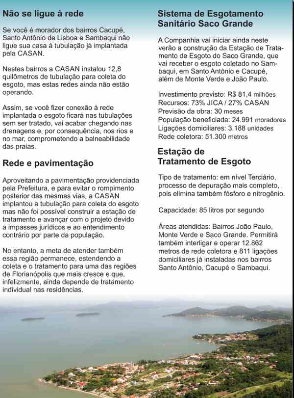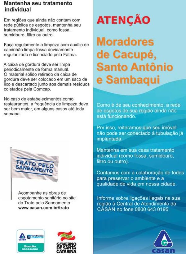 A CASAN está orientando moradores de Cacupé, Santo Antônio e Sambaqui para que não façam a ligação de suas residências à rede coletora de esgoto já implantada, mas que ainda não está em operação. O objetivo é alertar a comunidade neste período que antecede a temporada, buscando evitar problemas no ambiente e na balneabilidade da região.