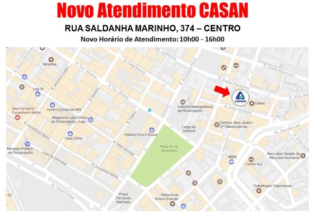 Começou às 10h desta quinta-feira, dia 2, o atendimento presencial da CASAN em área ainda mais central de Florianópolis. Ampla, a nova unidade funciona na Rua Saldanha Marinho, 374, Edifício Zigurate.