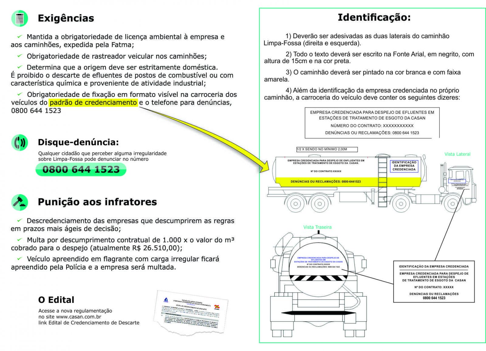 A CASAN começou nesta terça-feira, 20, a distribuir folders produzidos para informar os novos critérios de credenciamento para caminhões limpa-fossa. As normas passam a incluir os banheiros químicos usados por motorhomes e ônibus de turismo, que até agora não eram regulamentados nem fiscalizados.