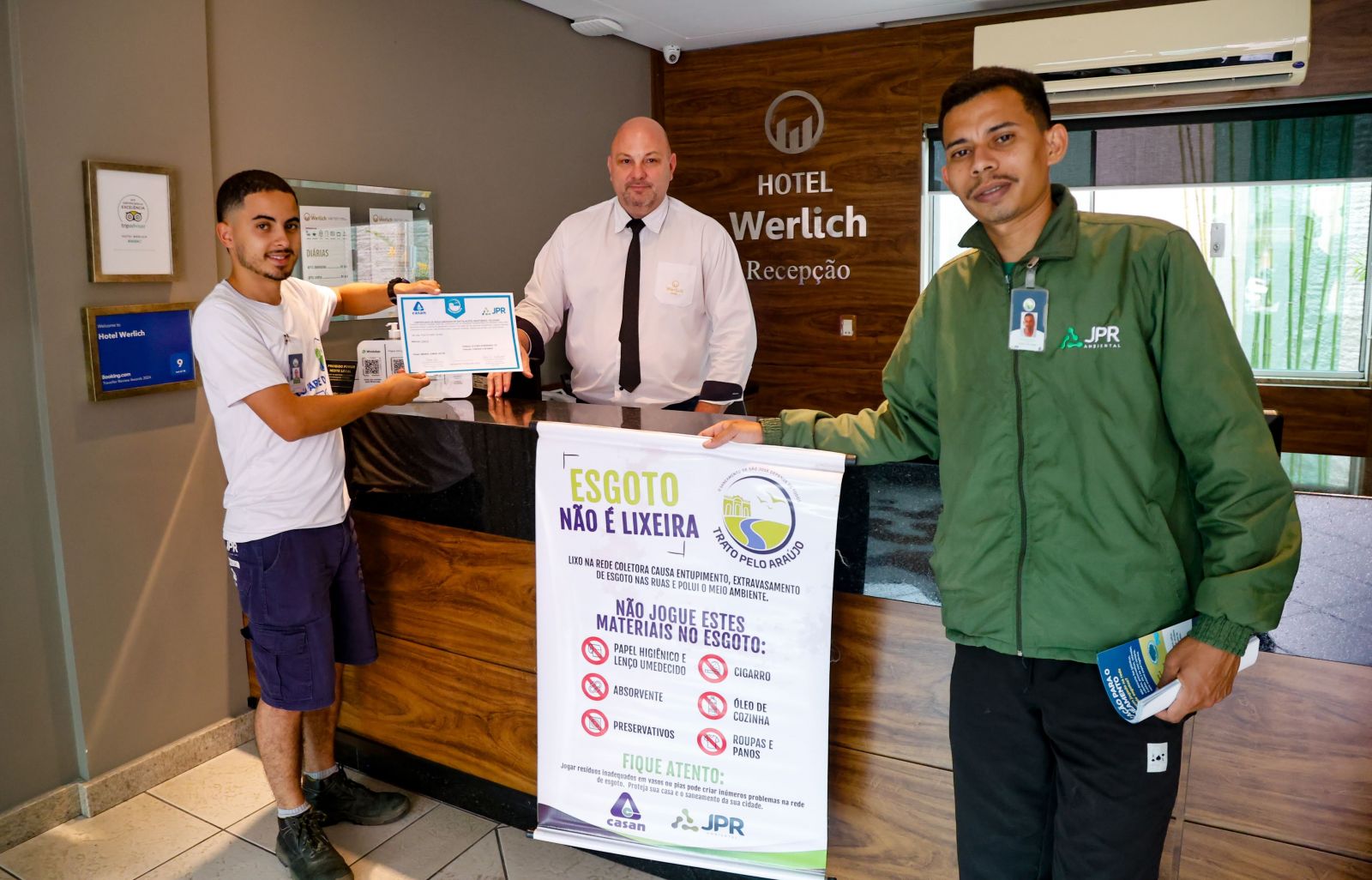 A Companhia Catarinense de Águas e Saneamento (CASAN) está reforçando sua atuação em uma área de hotéis e grandes condomínios na bacia do Rio Araújo, em São José. A iniciativa integra o programa Trato pelo Araújo e tem como objetivo ampliar o diálogo junto à comunidade e aos visitantes sobre a importância do uso adequado das instalações sanitárias, lembrando que vaso sanitário não é lixeira.