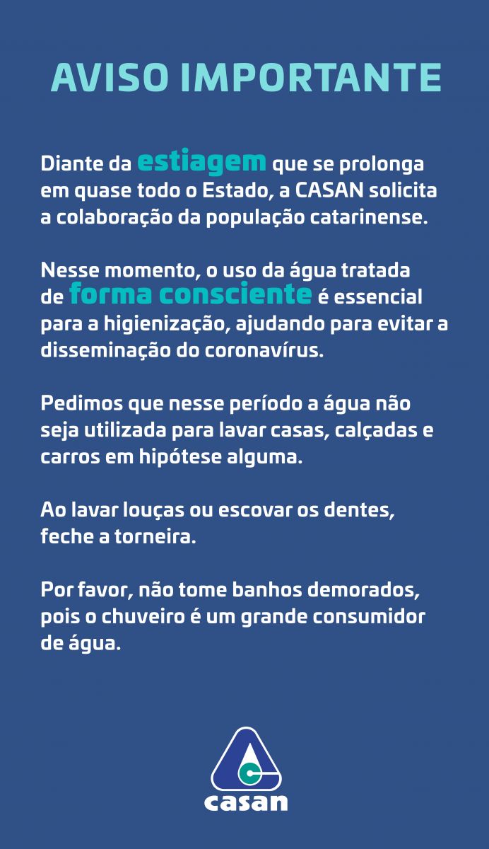 Diante da estiagem que se prolonga em quase todo o Estado, a CASAN solicita a colaboração da população catarinense.