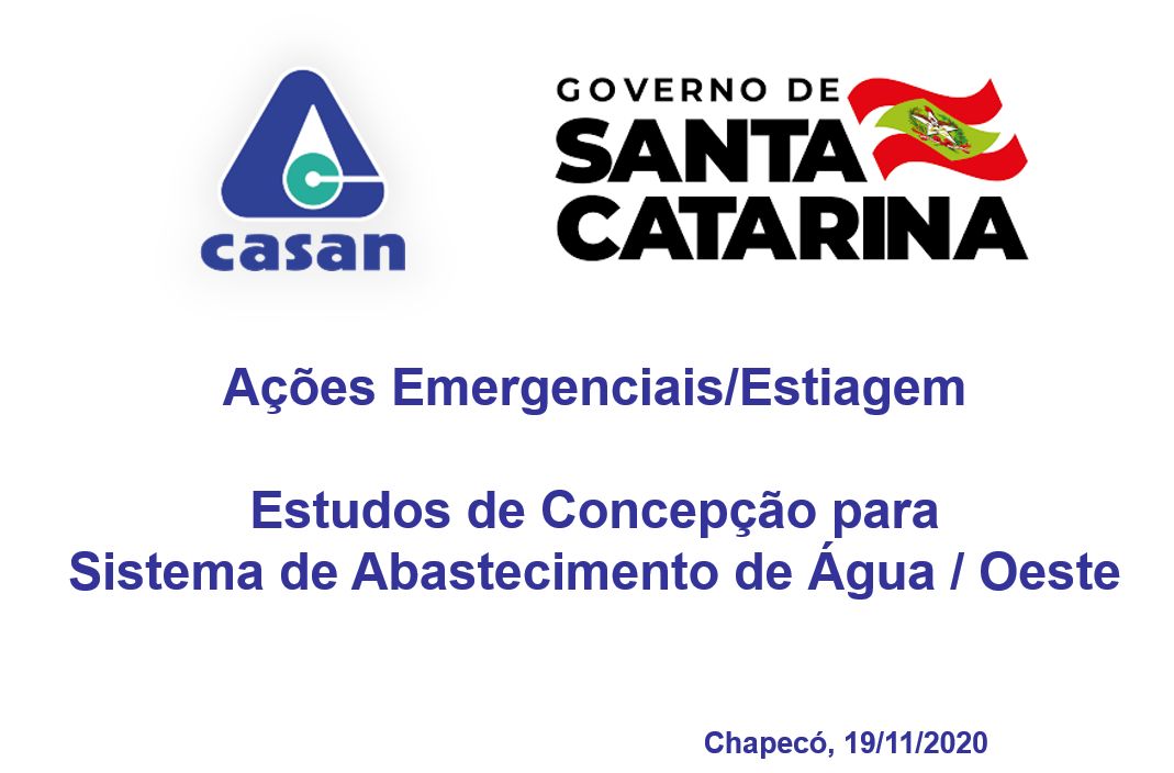 Às 10h de hoje, quinta-feira, dia 19/11, a Diretoria e engenheiros da CASAN darão Coletiva à Imprensa sobre as Ações Emergenciais que estão sendo implementadas no abastecimento de Chapecó, os investimentos e as ações estruturais de médio prazo.