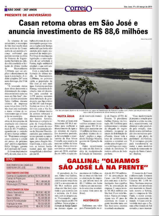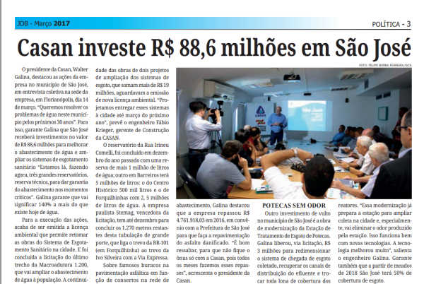 “A retomada destas duas obras demonstra a determinação da Companhia em investir cada vez mais em São José”, destacou o diretor-presidente da Companhia, engenheiro Valter Gallina, em coletiva na manhã desta terça-feira (14). Em sua apresentação, o presidente demonstrou que São José está recebendo o maior volume de investimentos que a CASAN já fez no município.