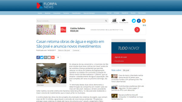 Às vésperas de seu aniversário, o município de São José recebe duas boas notícias da CASAN: acaba de ser emitida a licença ambiental que permite retomar as obras do Sistema de Esgotamento Sanitário na cidade e foi concluída a licitação do último trecho da Macroadutora 1.200, que vai ampliar o abastecimento de água à população. São José completa 267 anos no próximo domingo, dia 19.
