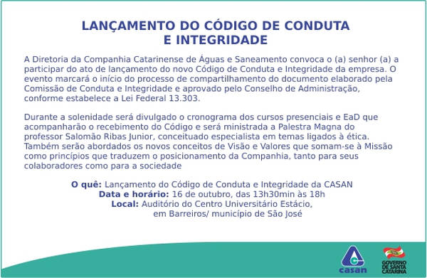Agenda: Ato de lançamento do Código de Conduta e Integridade da CASAN