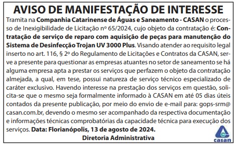 Tramita na Companhia Catarinense de Águas e Saneamento - CASAN o processo de Inexigibilidade de Licitação nº 65/2024, cujo objeto da contratação é: Contratação de serviço de reparo com aquisição de peças para manutenção do Sistema de Desinfecção Trojan UV 3000 Plus. Visando atender ao requisito legal inserto no art. 116, § 2º do Regulamento de Licitações e Contratos da CASAN, serve a presente para questionar as empresas atuantes no setor de saneamento se há alguma empresa apta a prestar os serviços que perfazem o objeto da contratação almejada, a qual, em tese, possui natureza de serviço técnico especializado de caráter exclusivo. Havendo interesse na prestação dos serviços em questão, solicita-se que o mesmo seja formalmente informado à CASAN em até 05 dias úteis contados da presente publicação, por meio do envio de e-mail para: gops-srm@casan.com.br, devendo o mesmo ser acompanhado da respectiva documentação e informações técnicas comprobatórias da capacidade técnica para execução dos serviços.
