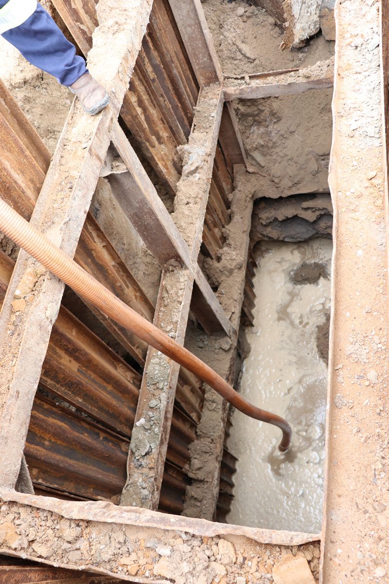 A finalização das interligações de redes coletoras teve de ser executada em valas de mais de 4 metros de profundidade, finalizando um trecho que em toda a sua extensão foi de grande dificuldade também pela presença de rede pluvial e lençol freático extremamente alto.