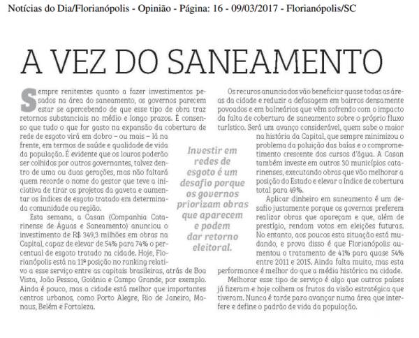 Editorial do Jornal Notícias do Dia destaca saneamento e investimentos da CASAN