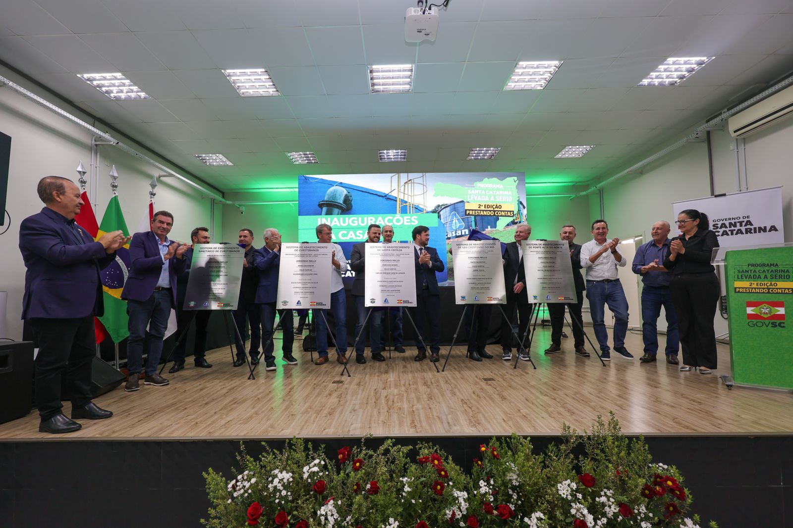 A edição do Programa Santa Catarina Levada a Sério - Prestando Contas na manhã desta sexta-feira (09) contou com a inauguração de quatro reservatórios de água e uma ampliação de Sistema de Esgotamento Sanitário da CASAN (Companhia Catarinense de Águas e Saneamento). O descerramento simbólico das placas pelo governador Jorginho Mello, o presidente da Companhia, Edson Moritz e demais autoridades, aconteceu em Curitibanos, município-sede da Associação dos Municípios da Região do Contestado (AMURC).