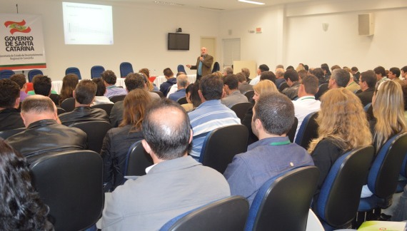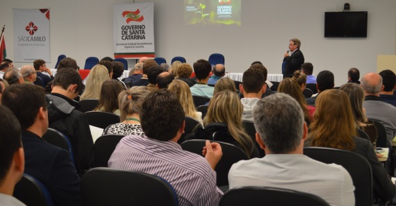 Apesar da chuva forte que caiu no final da trade e início da noite na região, o auditório do Hospital São Francisco ficou lotado para acompanhar as palestras do presidente da CASAN, Valter Gallina, e do secretário estadual de Agricultura e Pesca, Moacir Sopelsa.