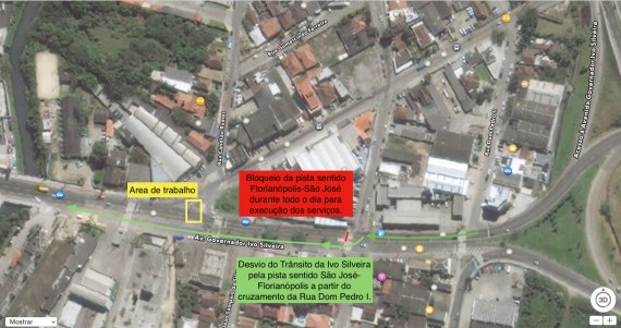 Para execução dos trabalhos o trânsito será bloqueado no sentido Florianópolis-São José durante todo o sábado. Os veículos serão desviados na avenida Ivo Silveira pela pista em sentido contrário, a partir do cruzamento da Rua Dom Pedro I, próximo ao semáforo em frente ao posto Angeloni. Também poderá ser desviado pelas ruas Dom Pedro II e Dib Cherem.