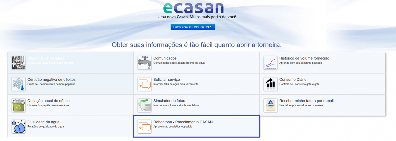 Portal eCASAN com o botão do Programa Rebentona. Foto: Acervo CASAN.