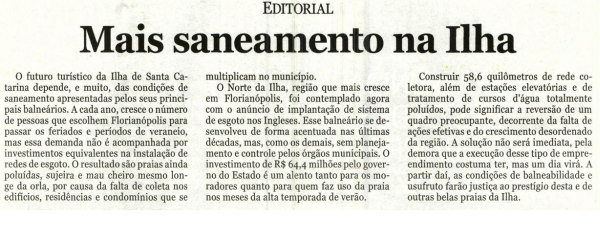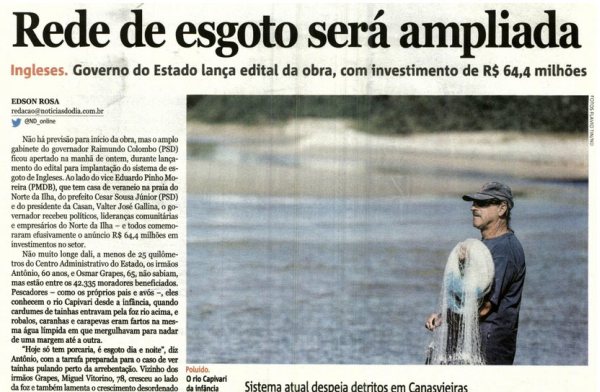 No Jornal Notícias do Dia, a notícia sobre o lançamento da obra de ampliação do Sistema de Esgotamento Sanitário de Ingleses foi destaque de capa, com o título Millhões contra o esgoto, e ganhou uma página inteira de conteúdo.