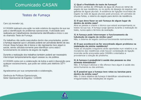 O teste será realizado no período da manhã, entre 8h e 11h, por equipe técnica da Companhia. A fumaça não é tóxica e não apresenta riscos à saúde, sendo utilizada apenas para identificar como está o sistema de esgoto.