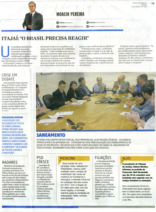Foto da reunião final com a JICA ocupando a maior parte da página de sábado do principal colunista de política de Santa Catarina, Moacir Pereira, destaca a importante semana de trabalhos entre 10 e 14 de agosto para a CASAN. Nesse período a Companhia recebeu visitas técnicas das duas agências internacionais de financiamento responsáveis por seu momento histórico de investimentos: a Agência de Cooperação Internacional do Japão (JICA) e a Agência Francesa de Desenvolvimento (AFD).
