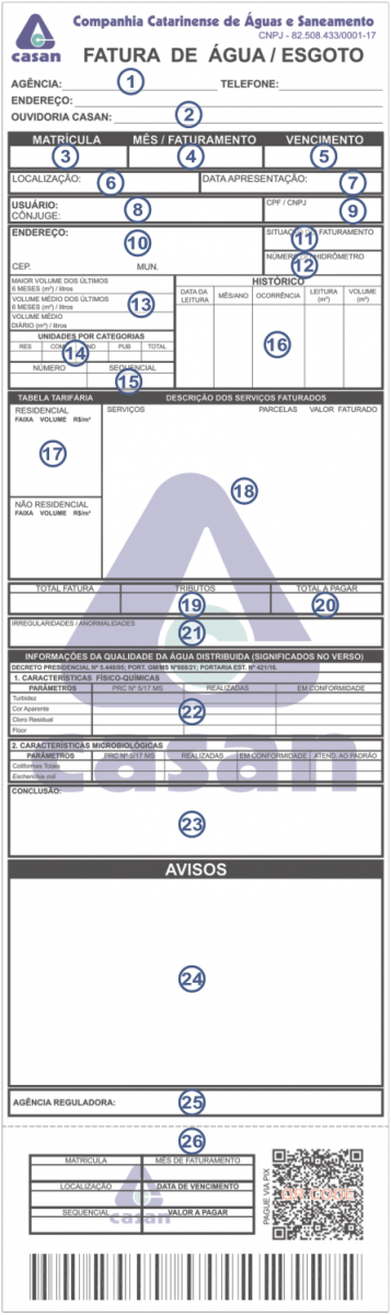 26. Uso da CASAN e Uso do Banco: parte da fatura destinada a descrição de dados essenciais para a identificação da fatura para fins de pagamento, é destacada na ocasião do pagamento da fatura nos caixas dos agentes bancários ou lotéricas.