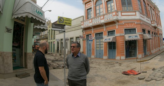 Chefe da agência e diretor de Expansão, Adelor Vieira, visitam obras de esgotamento sanitário no Centro Histórico de Laguna
