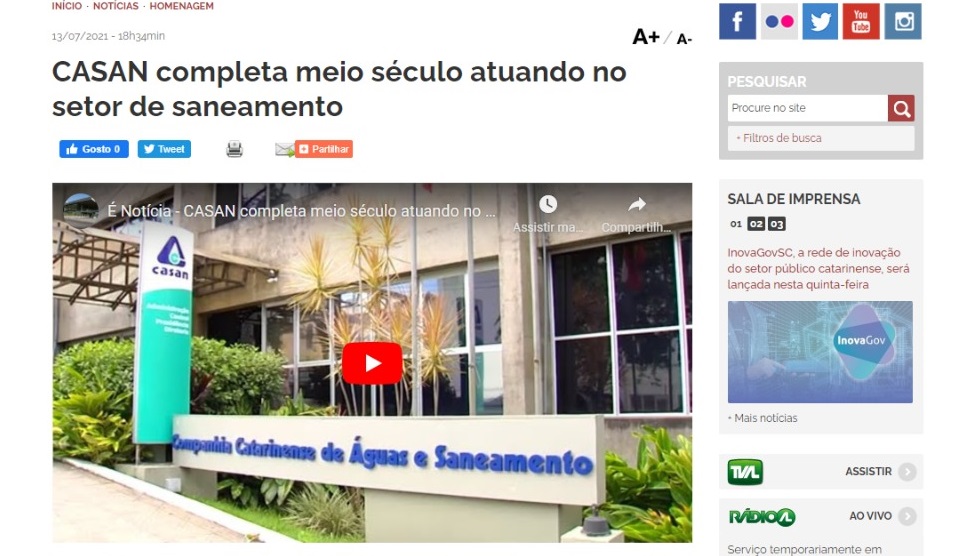 Em sessão realizada na tarde desta terça-feira, dia 13, a Companhia Catarinense de Águas e Saneamento foi homenageada pela Assembleia Legislativa do Estado pela passagem dos 50 anos da empresa.