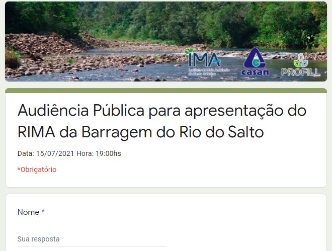 O IMA e a CASAN reforçam a necessidade de cadastro para envio de manifestações durante a Audiência Virtual da Barragem do Rio do Salto, que será realizada hoje, às 19h, de forma virtual.