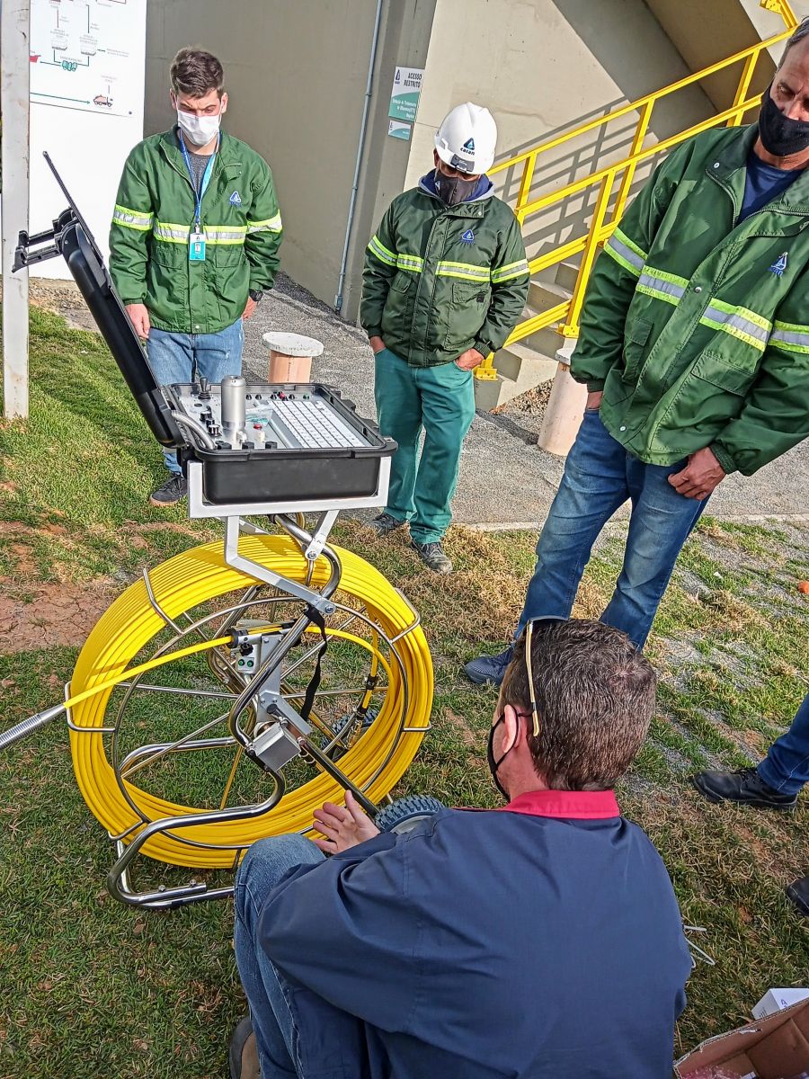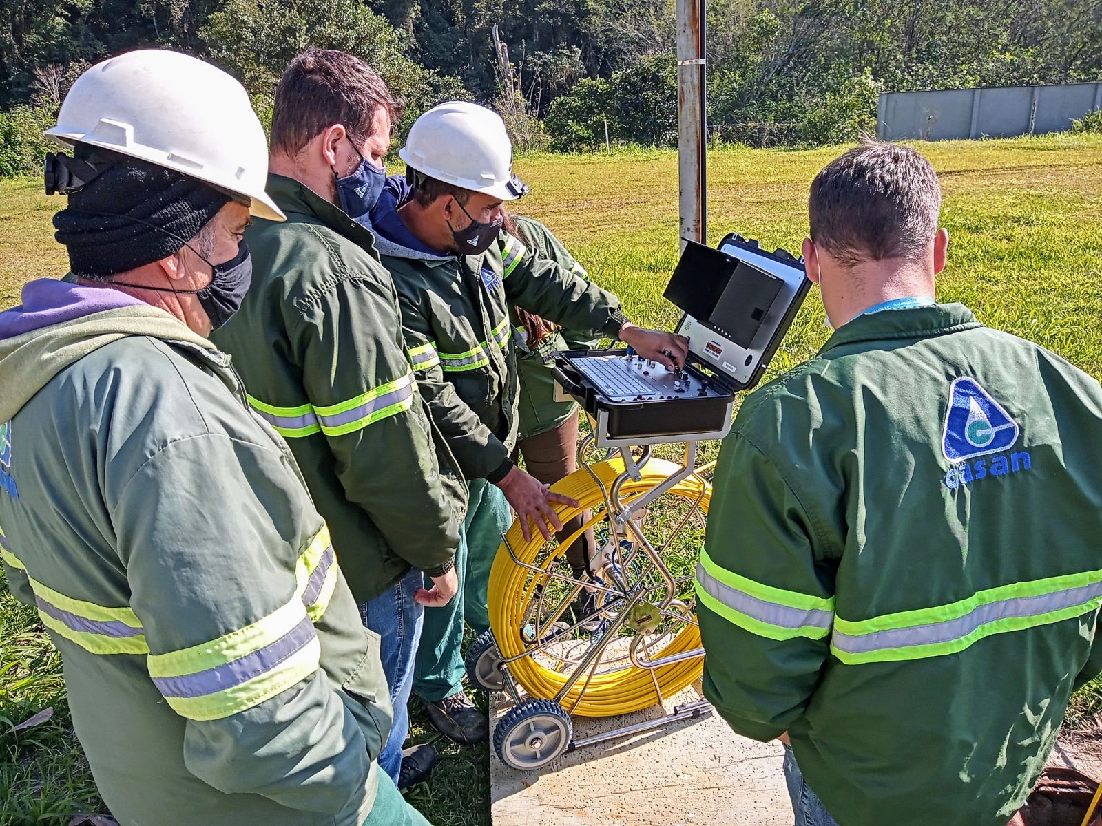 Os técnicos do Setor de Operação e Manutenção de Esgoto (SOMEG) da SRN, com sede em Rio do Sul, primeira unidade da Companhia a adquirir um equipamento com toda essa tecnologia, receberam treinamento teórico e prático, estando aptos a operar a câmera