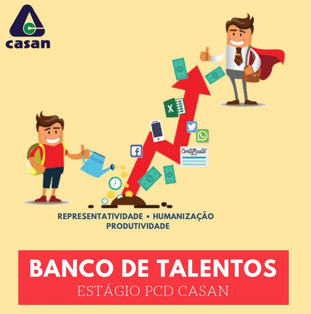 Com base nos pilares de representatividade, humanização e produtividade, a CASAN mantém um Banco de Talentos de Pessoa com Deficiência (PCD). Os interessados podem enviar o currículo em arquivo word ou pdf para o e-mail estagio@casan.com.br, com o assunto “Candidato para vaga PCD”. Surgindo alguma oportunidade de estágio na área, o setor entra em contato com o inscrito.