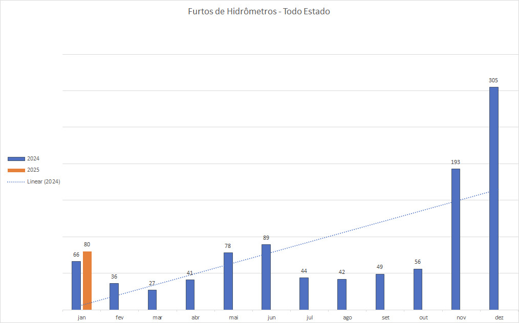 Nos meses de novembro e dezembro de 2024, foram contabilizados 465 furtos de hidrômetros nos municípios de Biguaçu, Florianópolis e São José. Só até o dia 07 de janeiro de 2025, já foram contabilizados 78 furtos nestes mesmos municípios. Esses números indicam que, em apenas oito dias, ocorreram aproximadamente 17% dos furtos registrados no período anterior, reforçando a preocupante tendência de crescimento desse tipo de ocorrência criminosa.