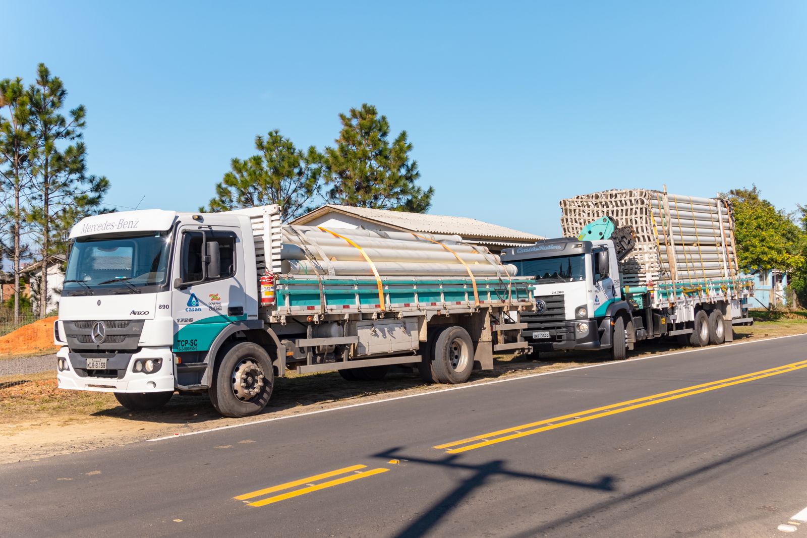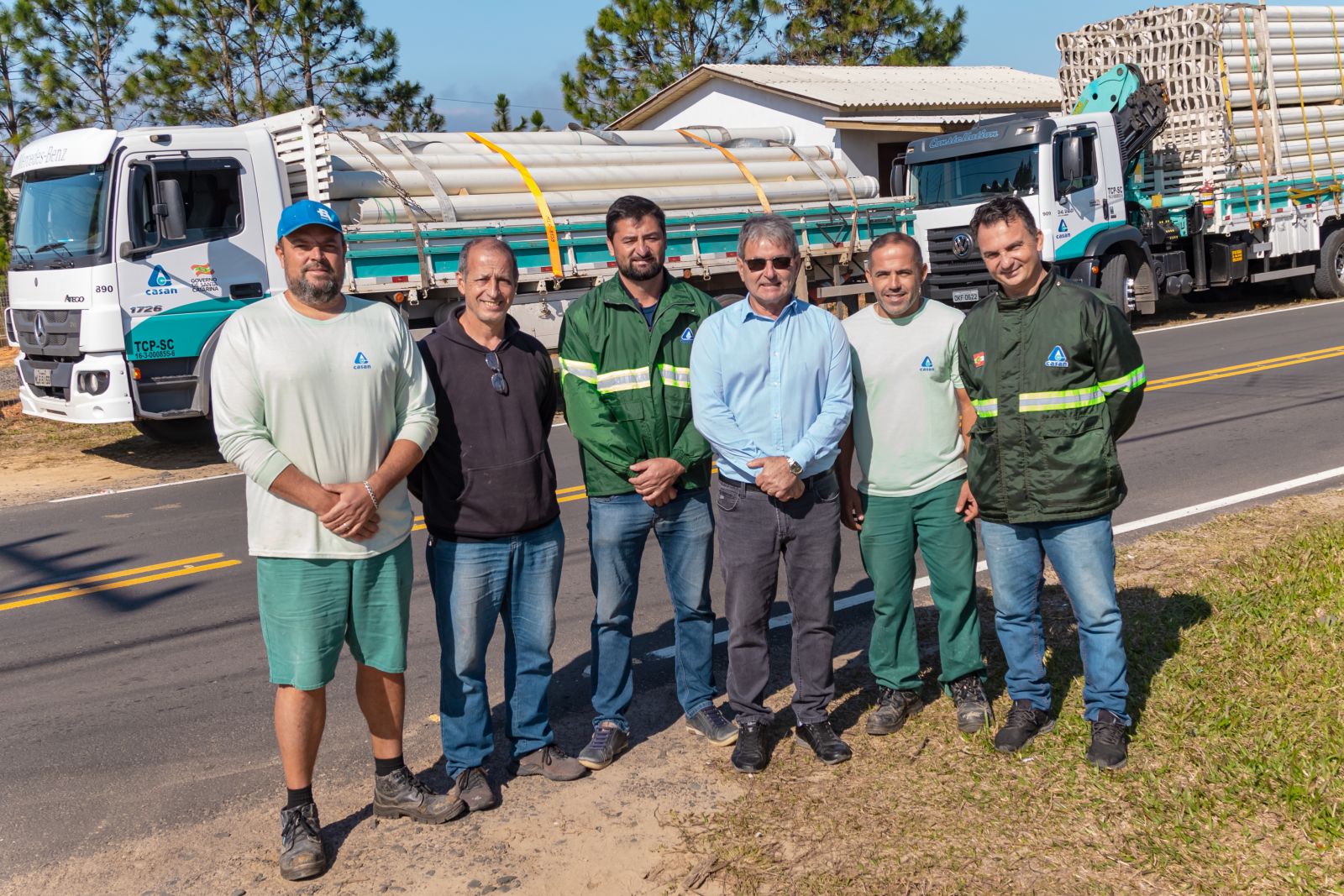 Funcionários da CASAN junto ao prefeito de Passo de Torres, Valmir Rodrigues, estiveram presentes na chegada dos caminhões trazendo novos materiais para as expansões de redes.