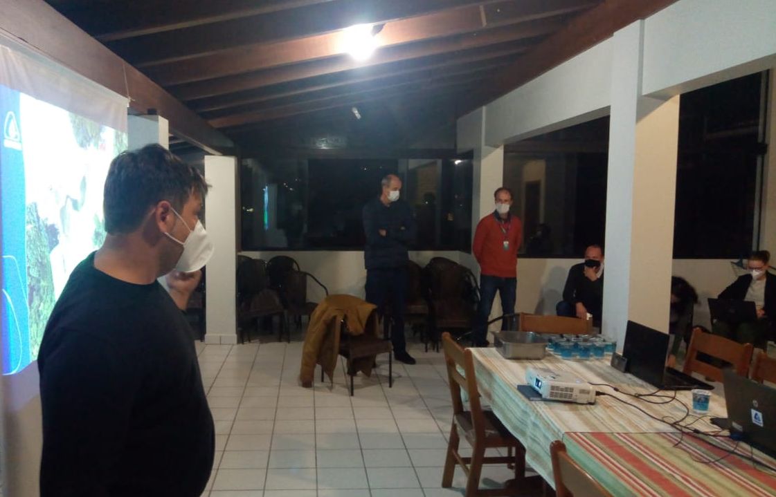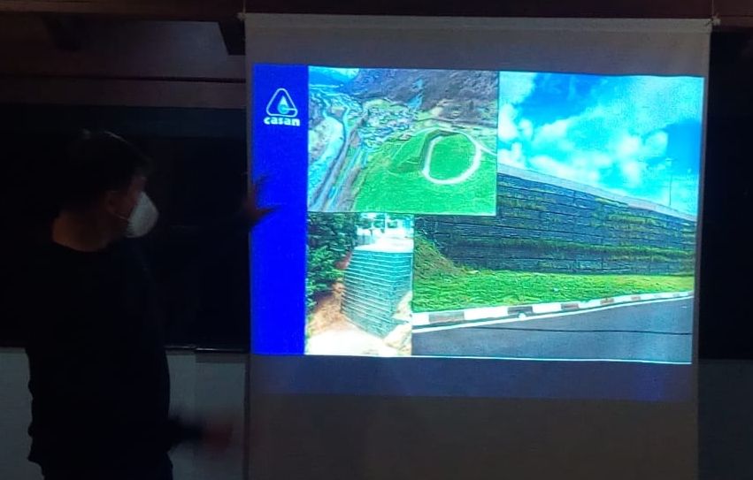 Os engenheiros Joel Horstmann, Alexandre Trevisan e Douglas Zimmermann demostraram como foi realizado o reforço no talude intermediário que separa provisoriamente as duas lagoas artificiais. Também falaram sobre os resultados da instalação do sistema emergencial de bombeamento executado em menos de 24 horas, após a autorização, devido à previsão de chuvas intensas para o fim de semana passado.