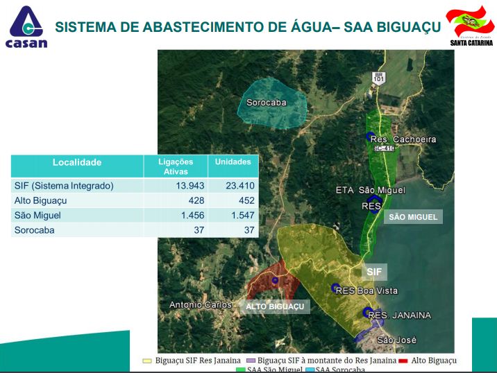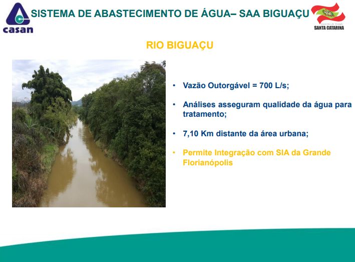 A nova captação no Biguaçu, que representará um investimento estimado em R$ 87 milhões, compreenderá também uma nova Estação de Tratamento de Água, um reservatório pulmão e uma adutora de 14 quilômetros, com diâmetro de 900mm, ligando as duas unidades.