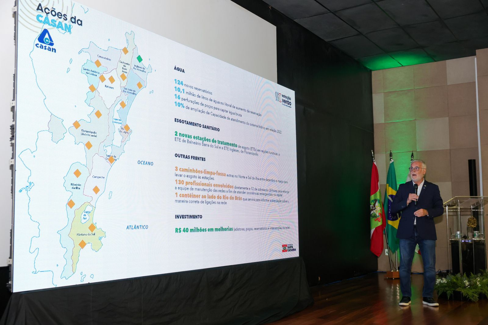 Durante o evento de apresentação do Estação Verão na manhã desta sexta-feira (14) com a presença do Governador Jorginho Mello, o presidente da CASAN (Companhia Catarinense de Águas e Saneamento) Edson Moritz apresentou um pacote de ações para a alta temporada. No total, a Companhia investiu R$ 40 milhões diretamente em melhorias nos setores de água e esgoto visando reforçar os serviços no verão.