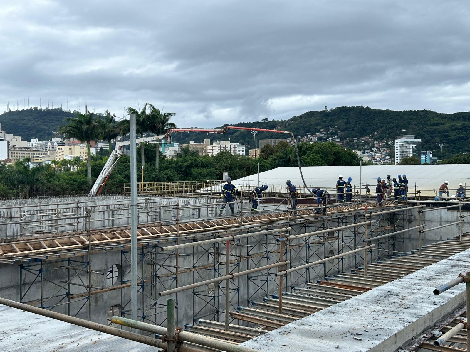 Uma nova operação de concretagem da CASAN (Companhia Catarinense de Águas e Saneamento) foi realizada nesta segunda-feira (13) nas obras de ampliação da Estação de Tratamento de Esgoto Insular, maior ETE de Florianópolis. A companhia utilizou cerca de 35m³ de concreto para construção da laje da Estação Elevatória de Gordura, das passarelas do Tanque Aerador 03 e das paredes do Reservatório de Geocálcio.