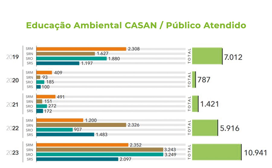 Com uma equipe de educadores ambientais que atua em todo o Estado, a CASAN atendeu em 2023 quase 11 mil estudantes. O número representa quase o dobro do público que participou de atividades oferecidas por profissionais do quadro funcional da Companhia em 2022, com 5.916 participações.