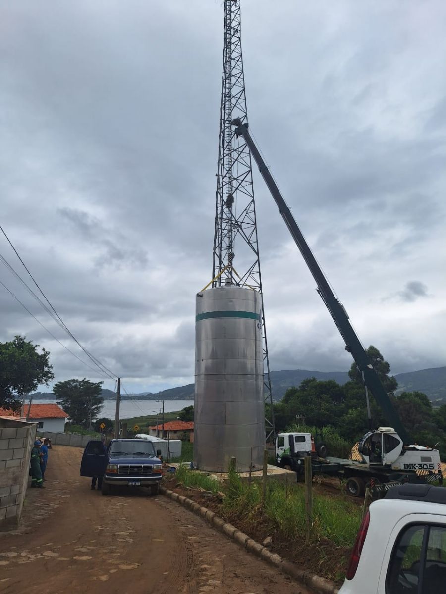 Em Pescaria Brava, no Sul, a CASAN (Companhia Catarinense de Águas e Saneamento) instalou nesta sexta-feira (5) um novo reservatório. Feito de aço inoxidável, a estrutura foi colocada na manhã de hoje sobre uma plataforma de cimento. O novo reservatório tem capacidade para 150 mil litros e vai beneficiar 1400 moradores no bairro Barreiros. O investimento total foi superior a R$ 300 mil.